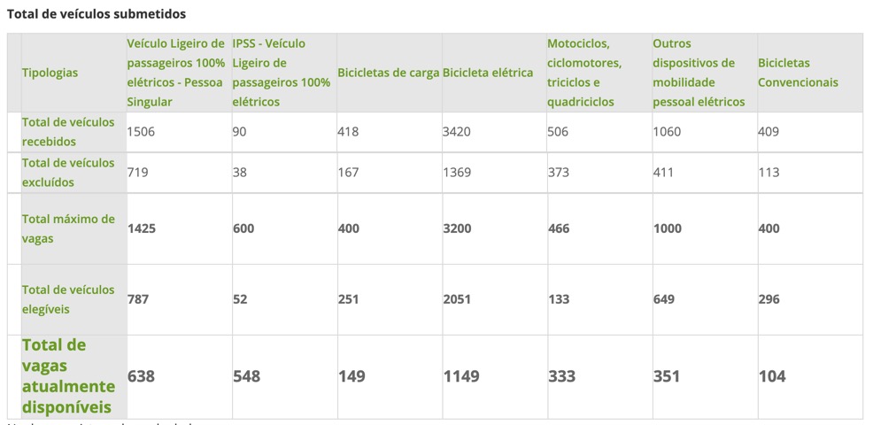 No entanto, acedendo ao site do Fundo Ambiental, é possível ver que atualmente ainda há muitas vagas disponíveis. Segundo as informações, há 638 vagas para veículos ligeiros de passageiros 100% elétricos e muitas outras vagas. Para bicicletas elétricas há 1149, aquando da escrita deste artigo.